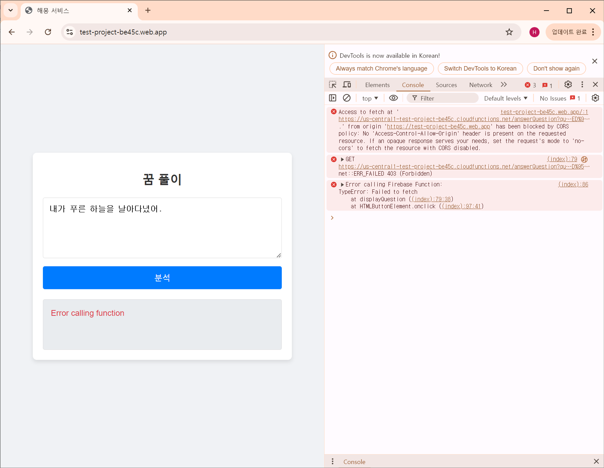 요청된 리소스(Cloud Function)가 'Access-Control-Allow-Origin' 헤더를 포함하고 있지 않아 브라우저가 요청을 차단하여 발생한 문제라고 한다. 코드를 열심히 수정해보았지만.... 해결이 되지 않았다....
