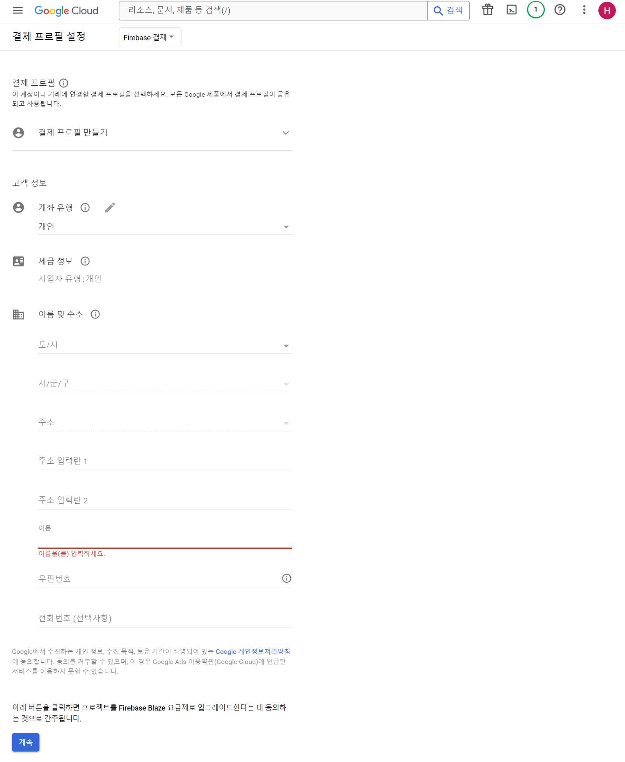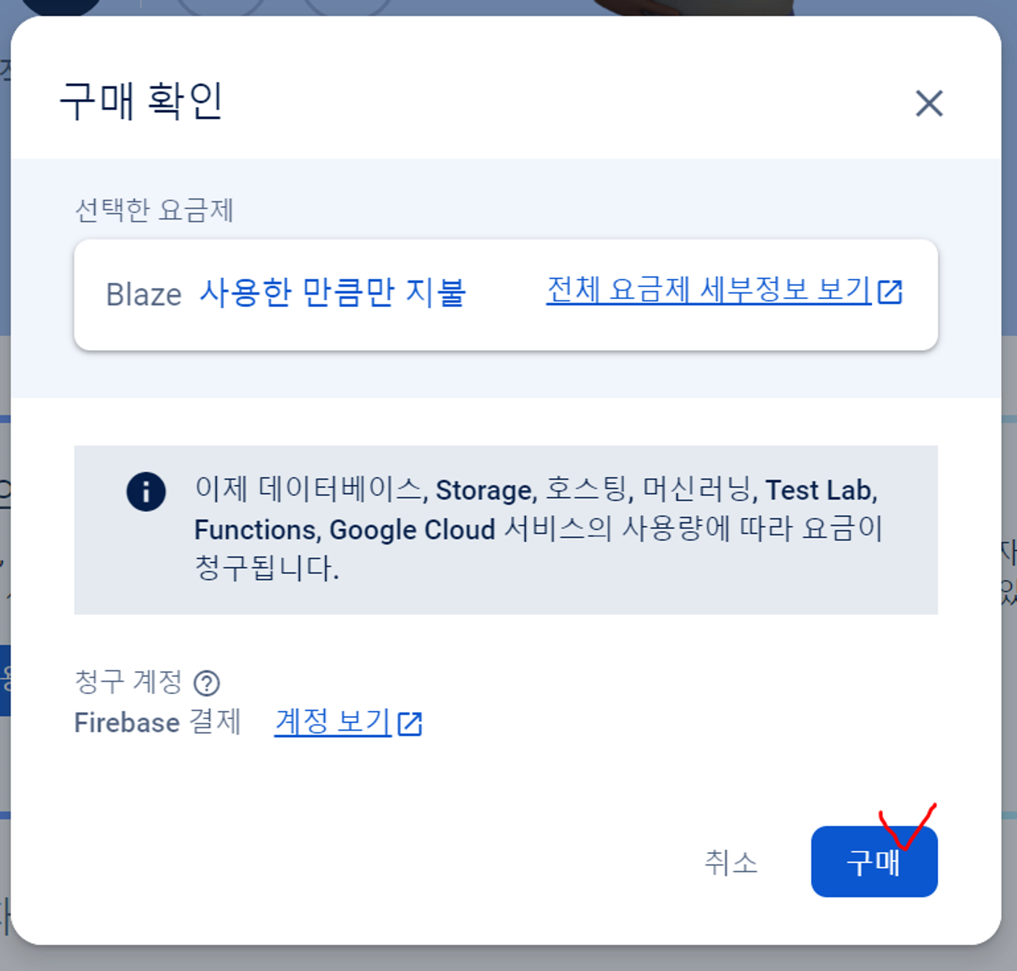 정보를 모두 입력 하면 Firebase 화면으로 돌아온다. 구매 버튼을 눌러 Blaze 요금제로 변경한다.